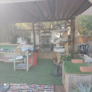 Wir konnten unseren wichtigen Aussenbereich mit einem zusätzlichen Dach erweitern und vergrössern. Ein Gemisch zwischen, Liege-Schutzplätze für die Freigänger , Lager für Futter und Allerlei sowie Arbeitsplatz für uns.